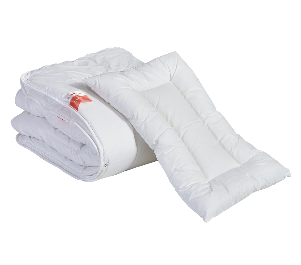 Komplet dwuczęściowy - kołdra letnia i kołdra wiosenno - jesienna. Zimą wystarczy połączyć je ze sobą napami rozmieszczonymi na krańcach obu kołder, aby otrzymać super ciepłą kołdrę zimową.