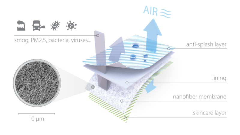 Maska RespiPro® składa się z kilku warstw tworzących funkcjonalną jednostkę ze złożonymi możliwościami filtrowania. Membrana RESPILON® chroni ludzki układ oddechowy przed wirusami, bakteriami i pleśnią, powodujące infekcje. Zatrzymuje również inne niebezpieczne cząstki, takie jak smog czy alergeny. Funkcja RespiPro® została wzmocniona przez ergonomiczny kształt i pasek samoprzylepny zapewniający najlepszą szczelność. Wszystkie te cechy są uzupełnione doskonałą przepuszczalnością.
